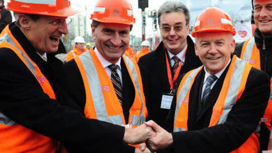 Die Politiker (von links) Wolfgang Schuster (Oberbürgermeister von Stuttgart), Günther Oettinger (damaliger Ministerpräsident von Baden-Württemberg), Werner Klingberg (Bahnchef Südwest), Rüdiger Grube (Vorstandsvorsitzender der Deutschen Bahn), Peter Ramsauer (Bundesverkehrsminister) und Jeannette Wopperer (Regionaldirektorin des Verbandes Region Stuttgart) reichen sich am 2. Februar 2010 auf einem Gleis auf dem Stuttgarter Hauptbahnhof beim feierlichen Baubeginn für das Bahnprojekt Stuttgart 21 die Hand. Danach gab es nicht mehr viel Grund zum Feiern, sondern zahlreiche Masenproteste.