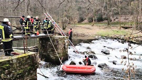 {element}Für die Helfer der Feuerwehr keine leichte Aufgabe, an den leblosen Körper heranzukommen. Über Leitern und Schlauchboote konnten die Helfer die Tote erst nach umfangreichen Sicherungs-Maßnahmen wegen der starken Strömung und der Rutschgefahr auf den Steinen aus der Nagold holen und an die Polizei übergeben. Gegen 15 Uhr war der Einsatz für die Feuerwehr beendet. Während der Bergung musste die Bundesstraße B463 im Bereich der Einsatzstelle halbseitig gesperrt werden.