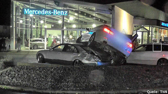 Die 19-Jährige war am Donnerstagnachmittag zu schnell gefahren und von der Straße abgekommen, wie die Polizei mitteilte. Der Wagen krachte in den Hof eines Autohauses und landete dort kopfüber auf einem zum Verkauf stehenden Wagen. Die 19-Jährige und ihr Beifahrer wurden leicht verletzt. Durch herumfliegende Trümmerteile wurden noch drei andere Fahrzeuge beschädigt. Es entstand ein Schaden von etwa 100 000 Euro.