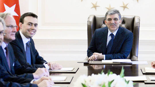 Der türkische Staatspräsident Abdullah Gül hat den baden-württembergischen Wirtschaft- und Finanzminister Nils Schmid (SPD, von rechts) in Ankara empfangen. Gül hat sich bei einem Treffen mit Schmid über die Ermittlungen zu einem Großbrand mit acht Toten im baden-württembergischen Backnang informiert.