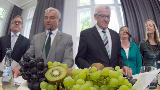Er lobte den fairen Umgang beider Seiten in teils «beinharten» Verhandlungen: «Von Sitzung zu Sitzung ist das Vertrauen gewachsen.» CDU-Frontmann Strobl sprach von teils «bockelharten» Verhandlungen, doch der Koalitionsvertrag enthalte genug schwarze Tinte. Er betonte dass «zwei fast gleich starke» Partner sich auf die Grundsätze einigten.