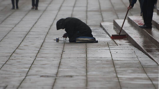 Eine Bettlerin kniet in Stuttgart auf der Königstraße.