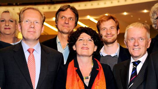 Die Kandidaten für die Wahl zum Oberbürgermeister der baden-württembergischen Landeshauptstadt Stuttgart, Sebastian Turner (vone links, parteilos, von CDU unterstützt), Bettina Wilhelm (vorne Mitte, parteilos, von SPD unterstützt) und Fritz Kuhn (vorne rechts, Bündnis 90/Die Grünen), haben in der Liederhalle in Stuttgart neben anderen Kandidaten für die Oberbürgermeisterwahlen in der Landeshauptstadt ihr Programm vorgestellt.