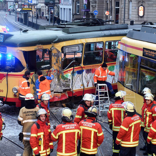 Sieben Rettungswagen und zwei Notärzte waren im Einsatz. Die Berufsfeuerwehr Karlsruhe, die den Rettungsdienst bei der Erstversorgung der Fahrgäste unterstützte, war mit einem Rüstzug, schwerem Gerät und Sonderfahrzeugen vor Ort. Der Eingleistrupp der Verkehrsbetriebe hob die Bahn wieder in die Gleise und wurde von der Berufsfeuerwehr mit ihren Einsatzmitteln unterstützt. Die Ermittlungen zur Unfallursache dauern derzeit noch an. Da zum Unfallzeitpunkt die Ampelanlage offenbar störungsfrei in Betrieb war, ist möglicherweise davon auszugehen, dass einer der Fahrer das für ihn geltende Haltesignal nicht beachtet hat. Es wird von einem Sachschaden im oberen sechsstelligen Bereich ausgegangen. Zur vollständigen Klärung der Unfallursache sucht die Polizei Zeugen, die zum Unfallhergang oder zum Stand der Haltesignale beim Unfall Angaben machen können. Sie werden gebeten, sich bei der Verkehrsunfallaufnahme Karlsruhe, Telefon 0721 944840, zu melden.