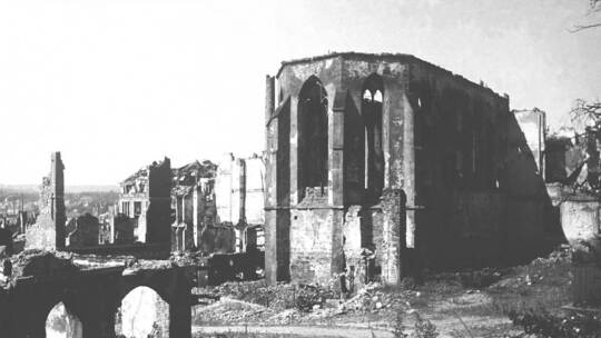 Zerstört wurde die Kirche aber nicht nur 1945. Bereits beim Stadtbrand 1689 wurde sie wie auch das Klostergebäude vernichtet.