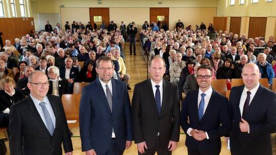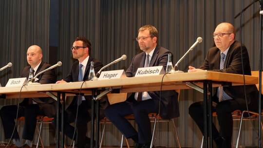 Vier Kandidaten und ein Wahlleiter Dirk Büscher (Mitte): Andreas Kubisch und Gert Hager (von links) stellten sich in der Eutinger Turnhalle ebenso vor wie (von rechts) Dimitrij Walter und Peter Boch.
