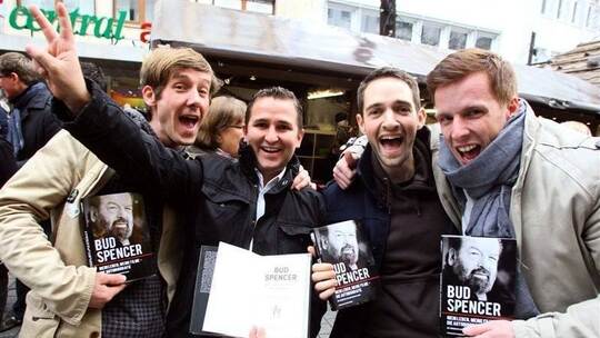 Das Warten hat sich gelohnt: Diese vier Bud-Spencer-Fans haben eins der begehrten Autogramme ergattert. Entsprechend groß ist die Freude.