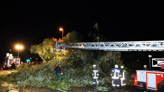 Das Unwetter tobte vor allem über Pforzheim. An der Habermehlstraße, Ecke Kirchenstraße, hatte der Wind kurz vor 3 Uhr eine mächtige Trauerweide umgeweht. Da der Baum die Straße blockierte, gesellte sich zum Donnergrollen bald das Sirren von Motorsägen. Die Pforzheimer Feuerwehr musste die Weide zersägen. Erst gegen 6 Uhr konnte die deshalb voll gesperrte Habermehlstraße wieder für den Verkehr freigegeben werden. 16 Helfer waren dort im Einsatz. Glücklicherweise sei zum Zeitpunkt, als der Baum kippte, niemand an der Unglücksstelle vorbeigefahren, sagte Feuerwehrkommandant Volker Velten. Insgesamt sei Pforzheim bei diesem starken Gewitter „wieder einmal glimpflich davongekommen“. In anderen Regionen habe das Unwetter noch heftiger gewütet.