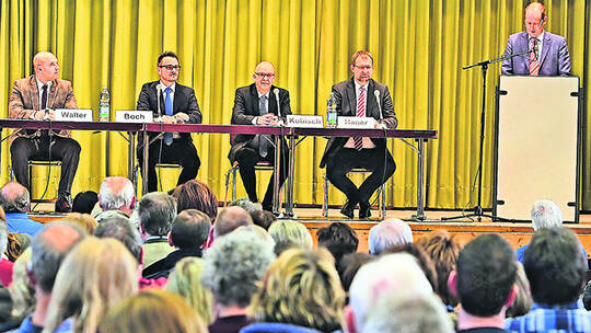 Stellen sich den Fragen der Bürger: (von links) die Herausforderer Dimitrij Walter (parteilos), Peter Boch (CDU) und Andreas Kubisch (Liste Eltern) sowie Amtsinhaber Gert Hager (SPD). Wahlleiter Dirk Büscher führt durch die Veranstaltung. Foto: Ketterl
