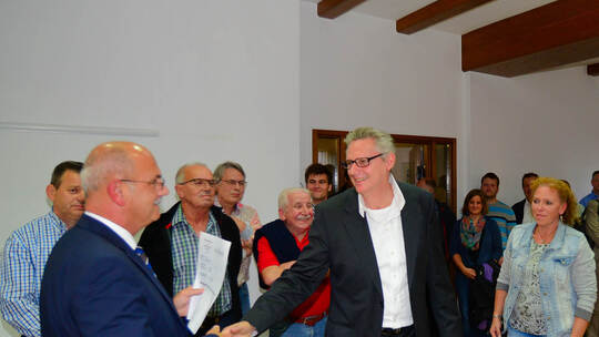 Der Moment der Entscheidung: Bürgermeister Thomas Karst (vorne links) hat im Eisinger Rathaus gegen 18.45 Uhr gerade bekanntgegeben, dass eine klare Mehrheit die Flüchtlingsunterkunft in der alten Turnhalle unterstützt. Roy Molnar und Susanne Wenzlaff von der kritischen Bürgerinitiative (vorne Mitte und rechts) demonstrierten per Händedruck, dass sie das Ergebnis respektieren. „Das ist Demokratie“, sagte Molnar. Foto: Martin Schott