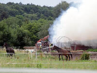 Die mit einer Solaranlage bestückte Scheune auf dem Gelände eines Aussiedlerhofes wurde durch ein Feuer zerstört. In der offenen Scheune lagerten rund 120 Strohballen. Ein an der Rückseite des Gebäudes angebautes Holzlager wurde ebenfalls in Mitleidenschaft gezogen. Der angrenzende Pferdestall wurde frühzeitig evakuiert. Der Stall und die Tiere konnten vor den Flammen gerettet werden. Die Feuerwehren aus Pforzheim, Neuenbürg, Birkenfeld und Keltern waren mit rund 100 Mann im Einsatz. Das DRK Birkenfeld sowie das THW unterstützten ebenfalls. Der entstandene Schaden wird auf rund 70 000 Euro geschätzt. Die Kriminalpolizei hat die Ermittlungen zur Brandursache übernommen.