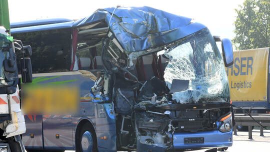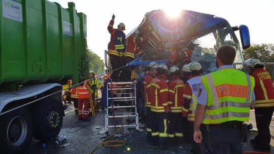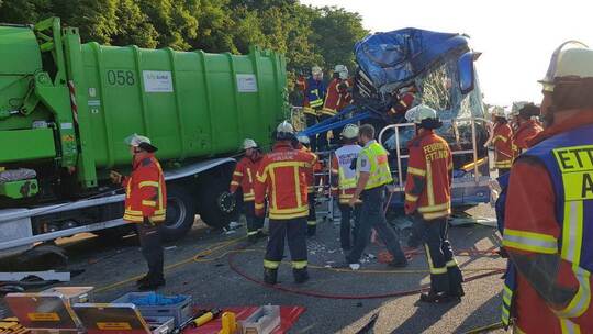 A5 bei Ettlingen: Reisebus knallt auf Müll-Auto