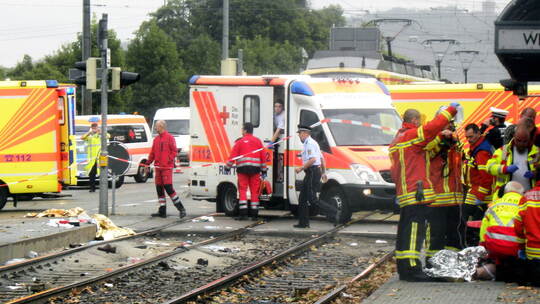 {element}{element}Nach den ersten Feststellungen des Verkehrsunfalldienstes war eine 34 Jahre alte Pkw-Fahrerin kurz vor 13 Uhr mit vermutlich überhöhter Geschwindigkeit auf der Durlacher Allee in Richtung Westen unterwegs gewesen. Zeugenaussagen zufolge fuhr die Frau dabei trotz Rotlichts in den Einmündungsbereich des Weinweges ein, wo es zum Zusammenstoß mit dem von rechts kommenden und bei Grün anfahrenden Auto eines 23-Jährigen kam. Hierbei wurde das Auto der Frau derart unglücklich nach links abgewiesen, dass das Fahrzeug mehrere auf der Fußgängerfurt bei der Straßenbahn-Haltestelle gehende Fußgänger erfasste. Erst nachdem das Auto auf die Schienen geschleudert war und dort noch weitere 60 Meter zurückgelegt hatte, kam das Auto schließlich im Gleisbett zum Stillstand.