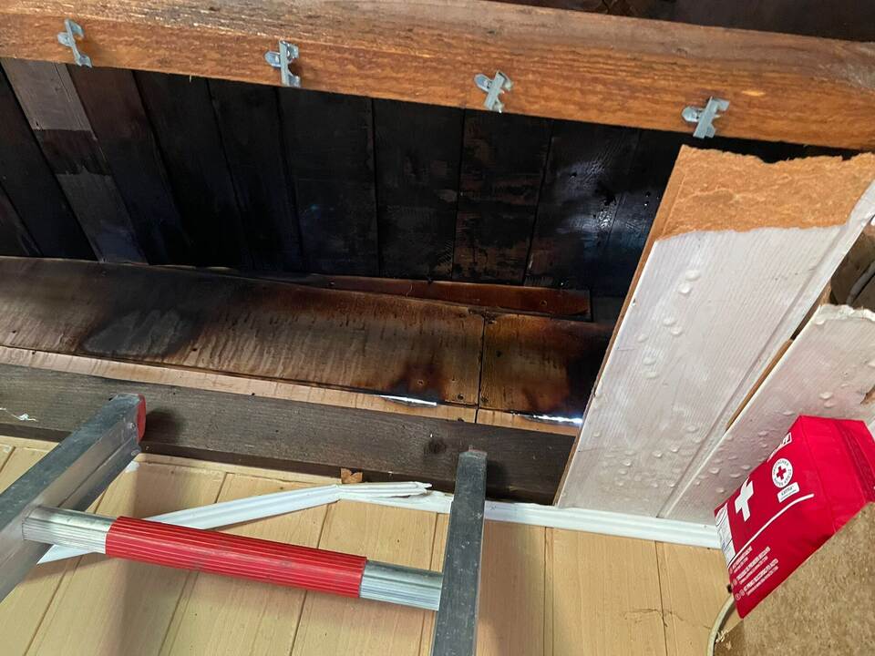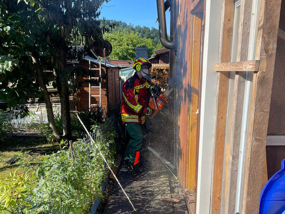 Mit einer Rettungssäge wurde die Decke der Gartenhütte geöffnet, die angebrannte Dämmung entfernt und darunter befindliche Glutnester abgelöscht. Ebenso mussten Teile der Eindeckung entfernt werden. Um an die Glutnester in den Wänden der Sauna zu kommen, musste diese weitestgehend komplett demontiert werden. Mit einer Rettungssäge musste hier die verbrannte Wandverkleidung entfernt werden, um an die darunter liegenden Glutnester zu kommen. Hierdurch zogen sich die Nachlöscharbeiten in die Länge.