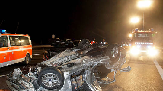 Es schleuderte zunächst nach rechts gegen die Leitplanken und dann quer über die Fahrbahn gegen die Mittelleitplanke. Der Ford überschlug sich und blieb auf dem Dach liegen. Während sich der schwer verletzte Fahrer noch aus dem Wrack befreien konnte, schaffte es seine Beifahrerin nicht. Sie war noch im Auto, als der Fahrer eines Kia nicht mehr bremsen konnte, in den Ford krachte und diesen wegschleuderte. Wenige Augenblicke später prallte noch ein Mercedes in das Wrack. Die 29-Jährige erlitt dabei tödliche Verletzungen.
