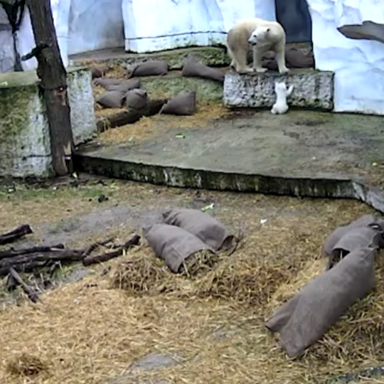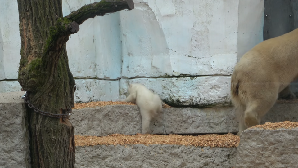 Nachdem Mutter und Kind die vergangenen zwei Wochen "backstage" verbracht hätten – unter anderem wurde der Nachwuchs erstmals tierärztlich untersucht und festgestellt, dass er ein Männchen ist –, erkunden sie im zweiten Videoausschnitt die Außenanlage, die in der Zwischenzeit geputzt und mit neuen Holzhäckseln ausgestattet worden sei. Die Eisbären wälzten sich gerne darin.