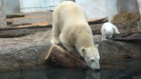 Darin sieht man, wie Nuka und ihr Kleiner am Wasser sind. Während die Mutter auch ins Wasser geht, traut sich der Kleine noch nicht hinein. Zu seiner Sicherheit seien Ausstiegshilfen angebracht worden, erklärt Reinschmidt, damit das Baby auch alleine herauskomme, sollte es einmal ins Wasser fallen.