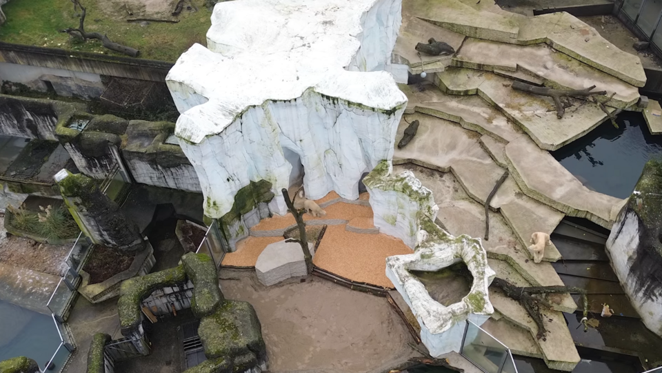 Über eine Drohnenaufnahme des Zoos sieht man das zweigeteilte Gehege: Links: Nuka und ihr Baby. Rechts, und von den beiden abgetrennt: Vater Kap, laut dem Zoodirektor beim Anblick von Nuka schon wieder in Paarungsstimmung. Und darum geht es auch im dritten Videoausschnitt.