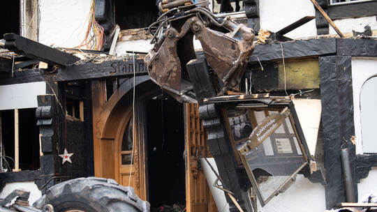Baiersbronn. Nach dem verheerenden Feuer im Drei-Sterne-Restaurant "Schwarzwaldstube" in Baiersbronn haben Brandermittler am Freitag erstmals die Ruine betreten. Zuvor waren wegen Einsturzgefahr Teile der Fassade und Balken abgerissen worden, wie ein Sprecher der Polizei in Karlsruhe sagte.