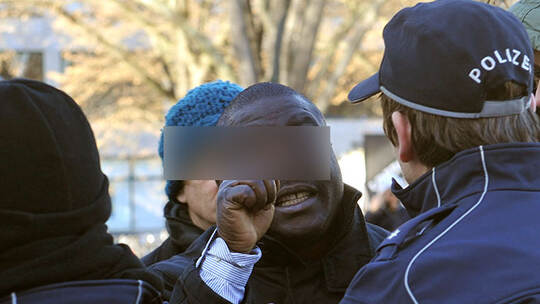 Später kam nach Informationen der Deutschen Presse-Agentur ein von den Migranten als Mittelsmann beauftragter Security-Mitarbeiter zu den Beamten. Die Botschaft war mit einem Ultimatum verbunden: Die Polizei müsse dem Togolesen binnen zwei Minuten die Handschließen abnehmen, andernfalls würden sie die Pforte stürmen. Daraufhin entschied die Polizei, dass der Security-Mitarbeiter einen Schlüssel mitnimmt, damit der Togolese von den Handschellen befreit wird. Der Mann soll danach untergetaucht sein.