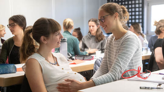 «Später stellt Ihr so fest, wie sehr sich die Gebärmutter anspannt», erklärt Dozentin Bettina Duesmann. Später heißt: Wenn die jungen Frauen statt den Pseudo-Schwangerschaftsbäuchen echte abtasten. Seit dem Wintersemester 2018/2019 sind sie Studentinnen der Hebammenwissenschaft - die ersten an der Universität Tübingen. Und ihre Arbeit ist gefragt, denn bundesweit fehlen Geburtshelfer.