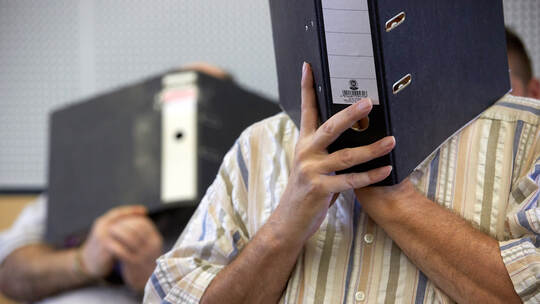 Die Angeklagten kommen zu dem Prozessbeginn und verbergen ihre Gesichter hinter Aktenordnern. Den Angeklagten im Alter von 40 bis 62 Jahren wird insbesondere zur Last gelegt, die kinderpornographische Plattform «elysium» im sogenannten Darknet und sexuellen Missbrauchs betrieben zu haben.