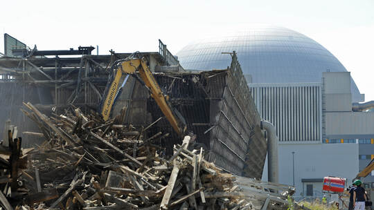 Ein Bagger reißt in Neckarwestheim einen Zellenkühlturm ab. Ende Mai 2012 begann die EnBW mit dem Abriss. Jetzt gibt es Zoff um den AKW-Bauschutt.