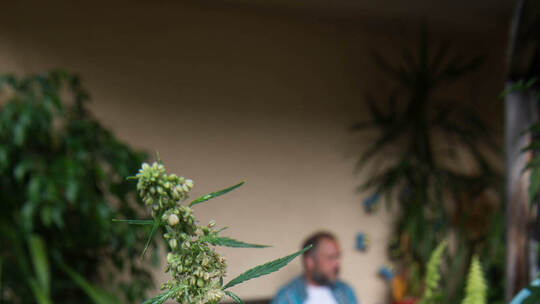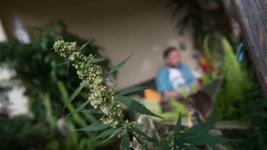Eine männliche Hanf-Pflanze (Cannabis) steht in Stuttgart auf einem Balkon, im Hintergrund ist Timo Strohmenger zu sehen. Strohmenger, der auch Sprecher des Cannabis Social Club Stuttgart ist, setzt sich für eine Legalisierung von Cannabis ein.