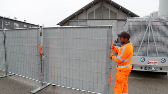 Mitarbeiter der Autobahnmeisterei Fischbach bauen zu Demonstrationszwecken spezielle Sichtschutzwände auf, die Unfallstellen von neugierigen Blicken abschirmen sollen.