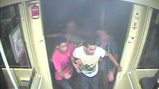 Diese beiden Fahrgäste sollen einen 25-Jährigen schwer verletzt haben. Die Polizei fahndet mit diesem Foto von der Überwachungskamera einer Straßenbahn.
