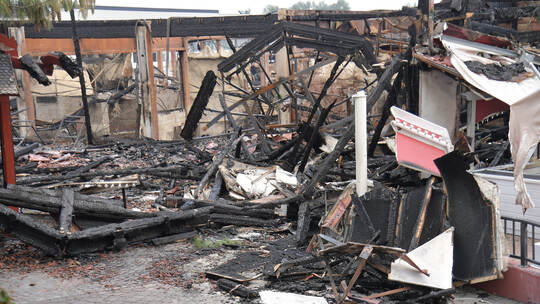 Verkohlte Überreste eines Gebäudes im Europa-Park. Die Ursache für das Feuer am 26. Mai ist immer noch unklar.