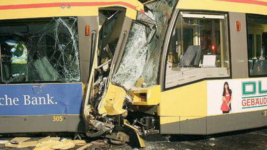 Wegen einer kaputten Weiche prallten in Karlsruhe am späten Donnerstagabend zwei entgegenkommende Straßenbahnen frontal aufeinander. Bei dem Zusammenstoß wurden 15 Menschen verletzt, vier von ihnen schwer. Der Sachschaden: rund 600.000 Euro.