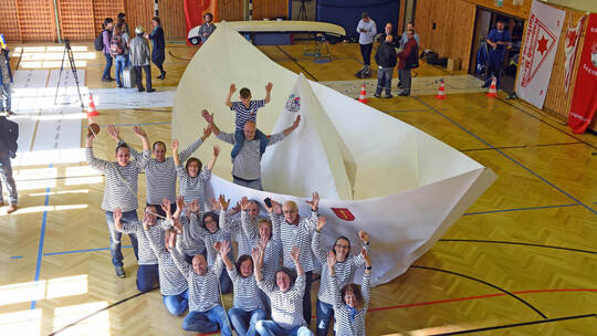 Für die Daxlandiade zum 300. Karlsruher Stadtgeburtstag wollen die Sportler des Kanukreises Karlsruhe das größte Papierboot der Welt falten. Als nautisches Ziel ist damit ein Eintrag ins „Guinness Buch der Rekorde“ angepeilt, vorausgesetzt, das Faltboot erreicht am 9. Mai 2015 zur offiziellen Messung eine Länge von 13 bis 14 Metern. Nach knapp einer Stunde Faltarbeiten in der Grundschule Daxlanden konnte das Team beweisen, dass die Technik, Koordination und Kommunikation zwischen den einzelnen Mitgliedern schon perfekt beherrscht werden. Denn die Dimensionen des Projektes sind enorm und erfordern ein hohes Maß an Logistik und Präzisionsarbeit.