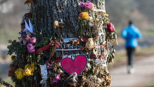 Blumen und Trauerschmuck hängen am 05.12.2016 in Freiburg (Baden-Württemberg) an einem Baum an der Dreisam. Hier wurde eine junge Frau umgebracht.