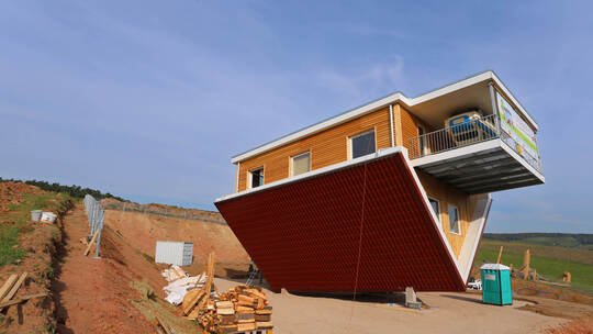 Verkehrte Welt: Ein Haus in Wertheim (Main-Tauber-Kreis) steht auf dem Kopf. Das Gebäude ist von einer Hamburger Firma gebaut worden, rund um die Jahreswende soll es dann für Besucher geöffnet sein. Er sei schon immer für neue, skurrile Ideen offen gewesen, sagte der Projektentwickler Burkhard Scheck am Dienstag.