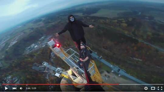 Auf dem Clip ist zu sehen, wie die Eindringlinge in der Dämmerung mit Handykameras und getarnt durch schwarze Kapuzenpullover, Tücher und Masken den Kran am derzeit 244 Meter hohen Testturm des Industriekonzerns ThyseenKrupp erklimmen. Dann laufen sie ohne Sicherung mit Sportschuhen den Ausleger entlang. Sie halten sich dabei nur an den Stangen des Krans fest, teils in der Luft hängend. Die «Neue Rottweiler Zeitung» hatte zuerst darüber berichtet.