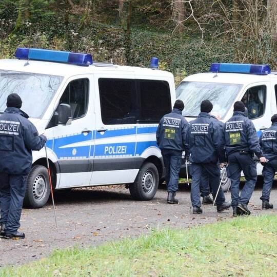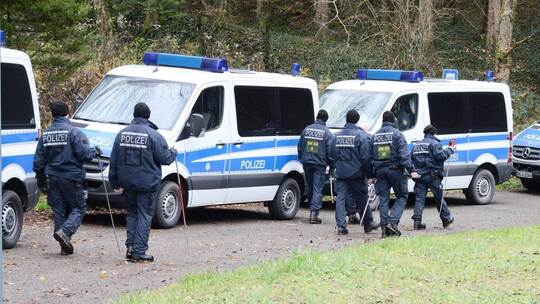 Polizisten durchsuchen am 08.12.2014 ein Waldstück am Rande von Waldshut (Baden-Wuerttemberg) ...