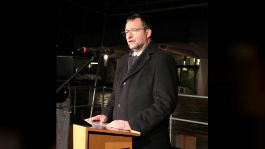 OB Gert Hager hat bei der Kundgebung "Fackeln aus" auf dem Pforzheimer Markplatz den Wert von Frieden, Freiheit und Demokratie betont: Fotos: Ketterl