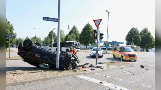 Bei einem schweren Unfall am Mittwochvormittag in der Pforzheimer Nordstadt ist ein Auto auf dem Dach liegen geblieben, zwei Menschen wurden verletzt.