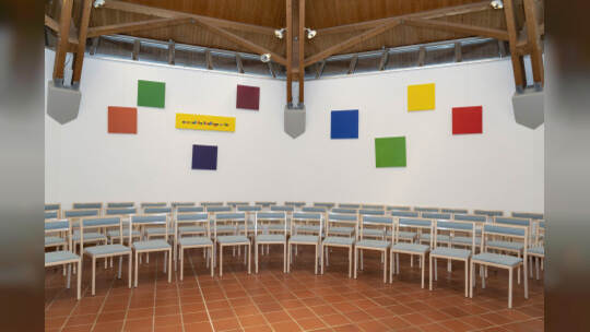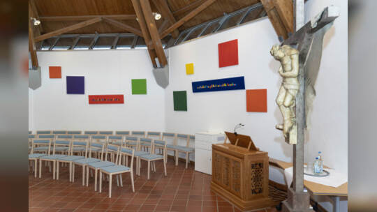 Eine Irritation: Ungewohnt bunt und leuchtend erscheinen die Wände der Kapelle im Hohenwart Forum. Wie Wellenlinien breitet sich das Licht der 20 monochromen Farbtafeln von Jürgen Goertz berühmter Christus-Skulptur nach beiden Seiten aus. Fotos: Moritz