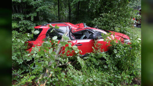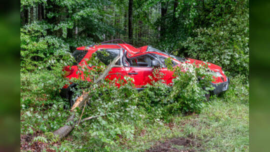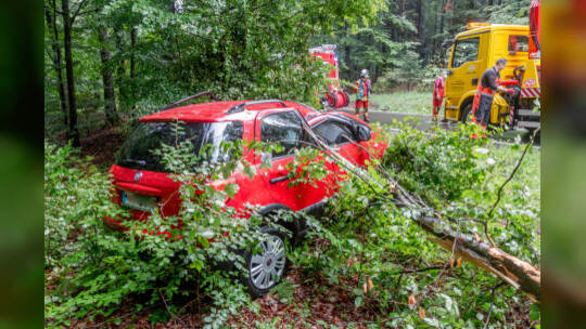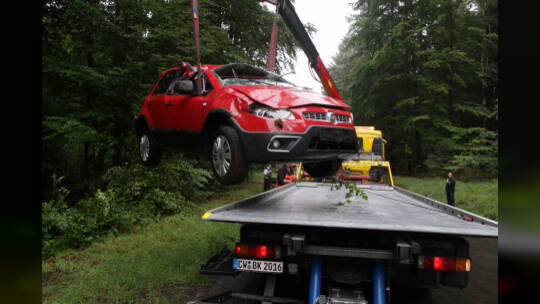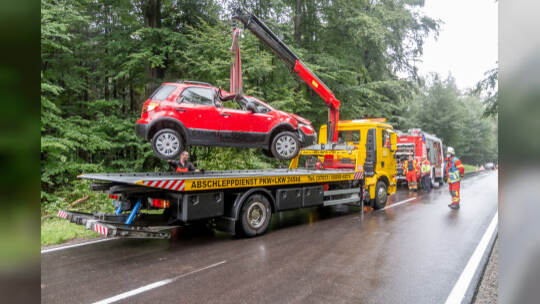 Auf regennasser Fahrbahn ist am Freitagmorgen eine Autofahrerin zwischen Dobel und Neuenbürg Dennach von der Fahrbahn abgekommen. Die Frau überschlug sich mit ihrem Wagen und wurde verletzt. Fotos: Aaron Klewer/Einsatz-Report24