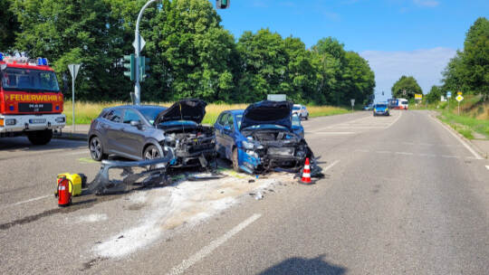Bei einem Frontalzusammenstoß auf einer Kreuzung auf der B10 bei Mühlhausen sind am Mittwochmorgen zwei Menschen schwer verletzt worden.