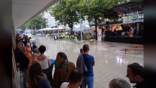 Platzregen hat dafür gesorgt, dass einige Programmpunkte bei der feierlichen Eröffnung der neuen Fußgängerzone in Pforzheim sprichwörtlich ins Wasser gefallen sind.