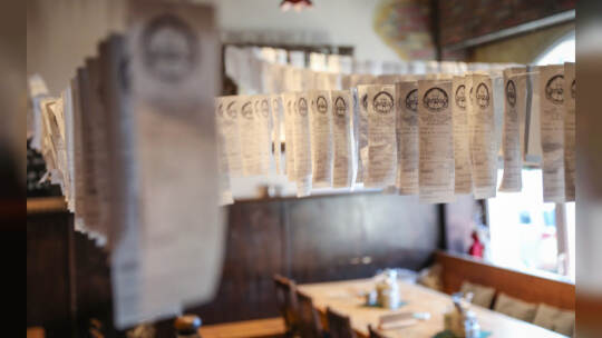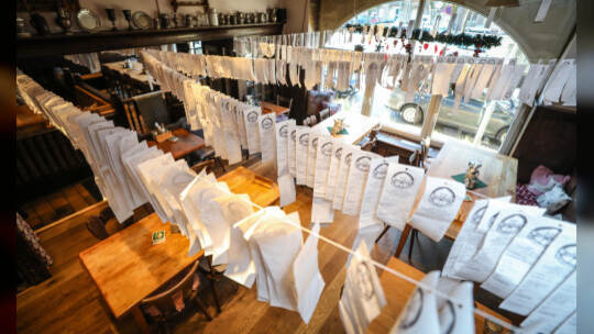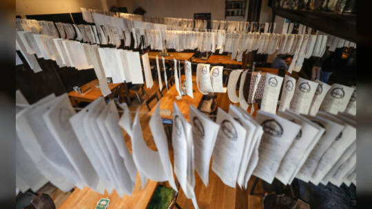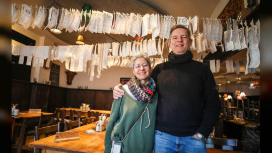 Dekorativer Protest gegen die zum Jahresbeginn geplante Bonpflicht: Das Karlsruher Restaurant "Gasthaus Gutenberg" hat eine Woche Papierbelege gesammelt, an Leinen aufgehängt und damit eine ganze Gaststube geschmückt. Fotos: dpa