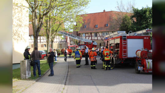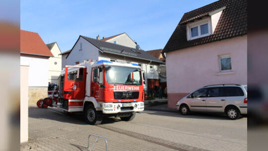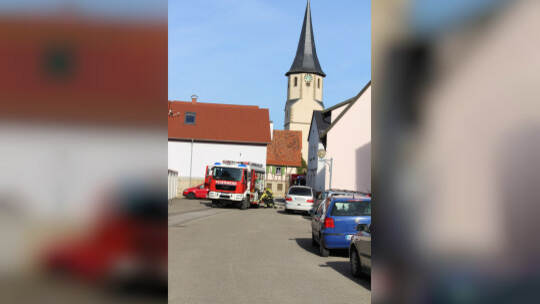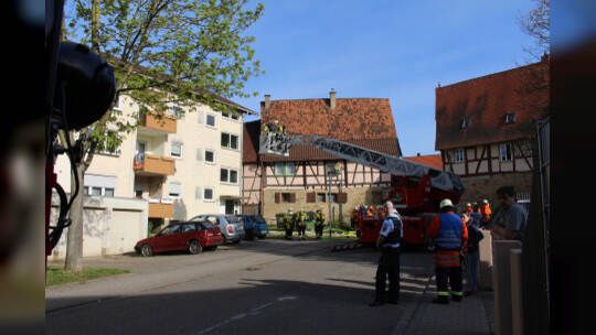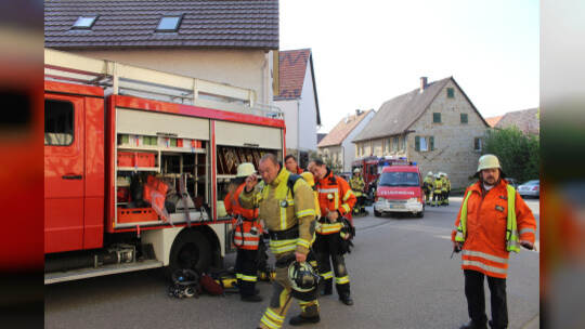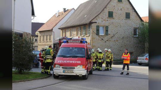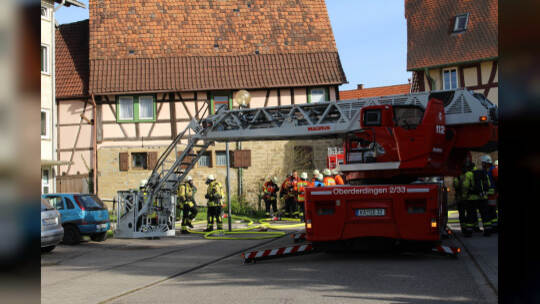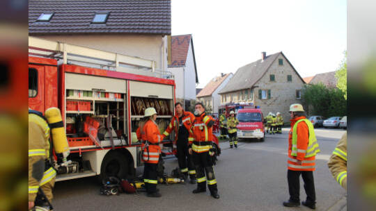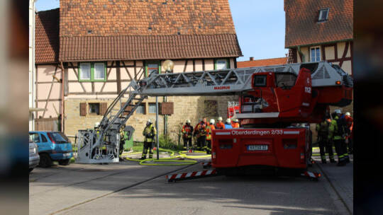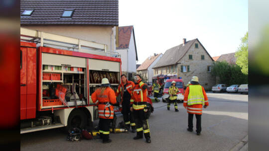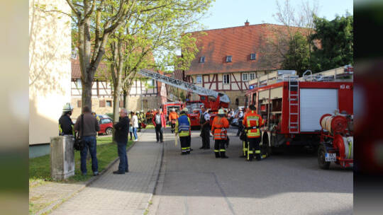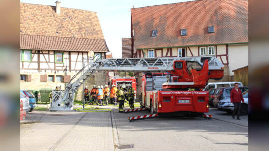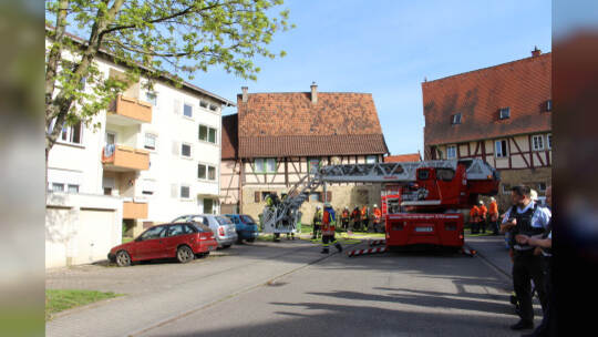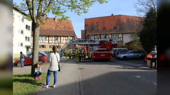 Mit der Drehleiter mussten mehrere Bewohner eines Hauses in Kürnbach gerettet werden. Ein Kellerbrand hatte das Treppenhaus total verraucht.