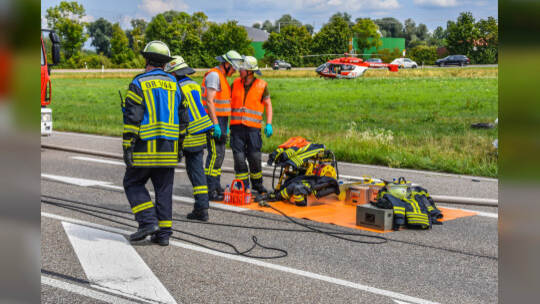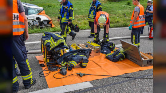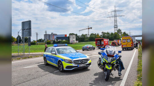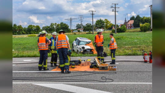Karlsruhe: Die Person, die am Steuer des Kleinwagens saß, wurde in ihrem Fahrzeug eingeklemmt und verstarb noch am Unfallort. Fotos: Sebastian Werner/Einsatz-Report24