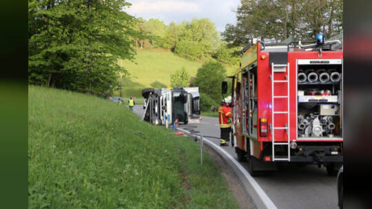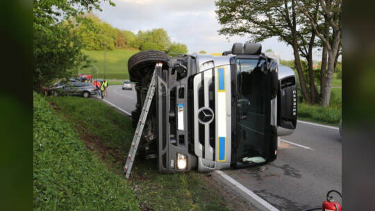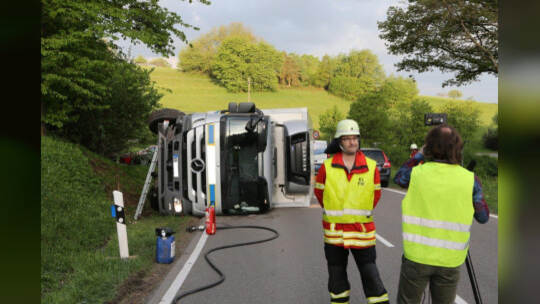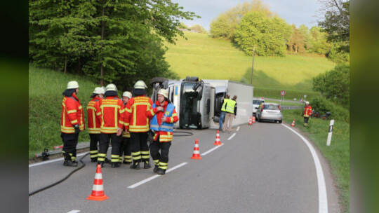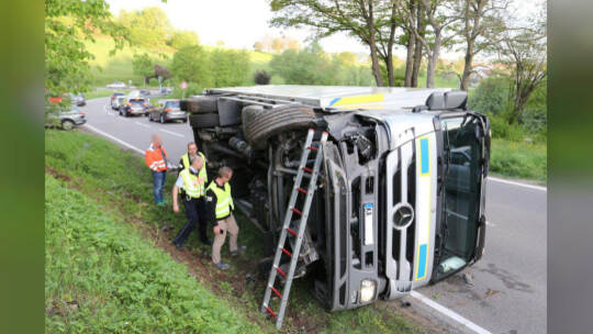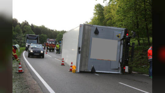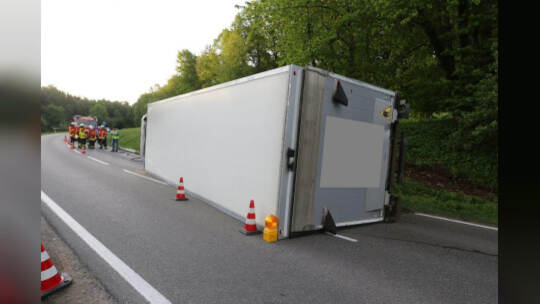 Lebensmitteltransporter kippt um: Kreisstraße blockiert