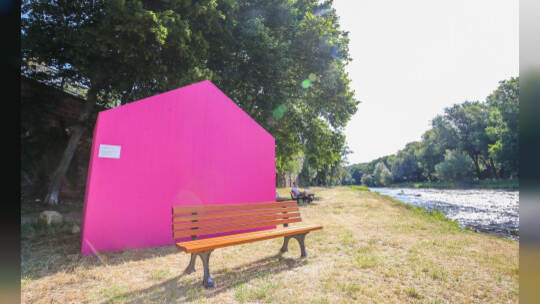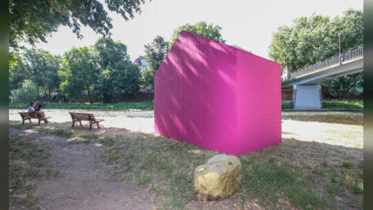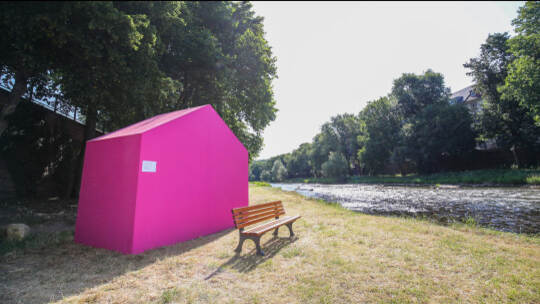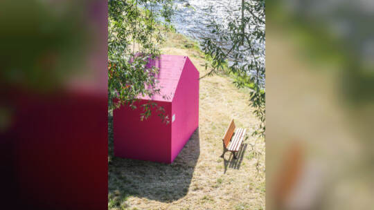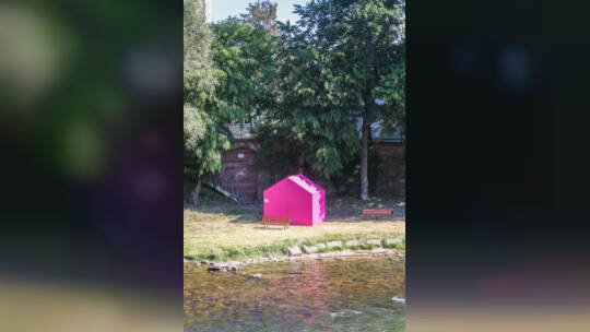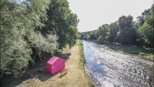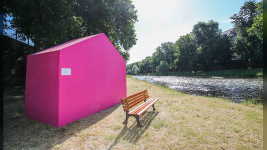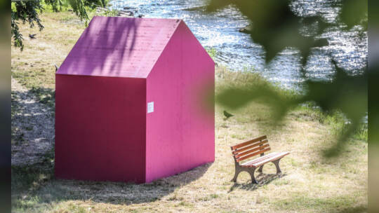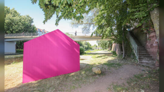 Das erste Magenta-Haus von Andreas Sarow ist am Dienstag am Enzufer aufgestellt worden. Das Haus stammt aus der Kunstinstallation "factory" die an der Unteren Wilferdinger Straße in Pforzheim zu sehen ist.
