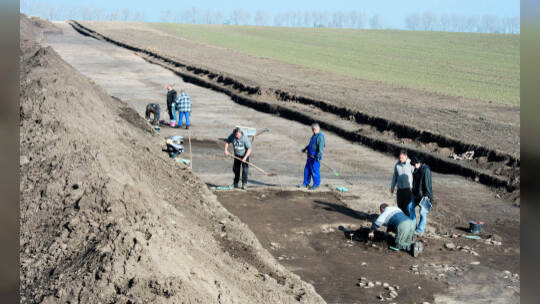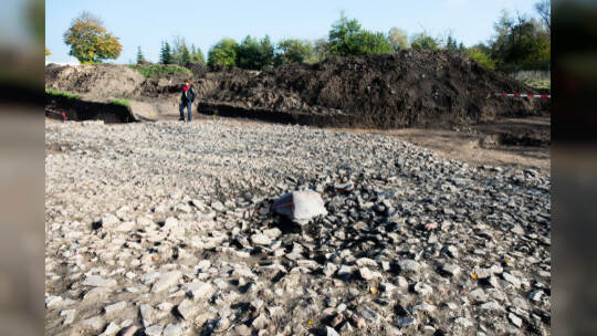 Überreste einer mittelalterlichen "Fernfahrerraststätte" haben die Archäologen des Landesamtes in Peißen (Sachsen-Anhalt) inmitten eines vor 700 Jahren aufgegebenen Dorfes entdeckt. Erhalten sind ein Brunnen, Wagenspuren, ein gepflasterter Platz als großzügig angelegte Haltebucht sowie die Grundrisse mehrerer Verkaufsbuden. Fotos: dpa