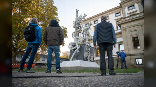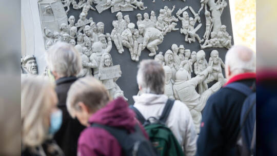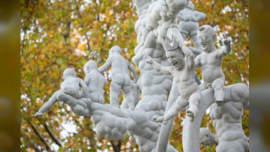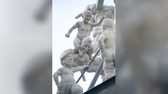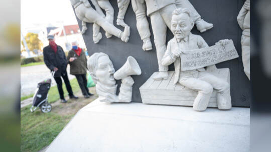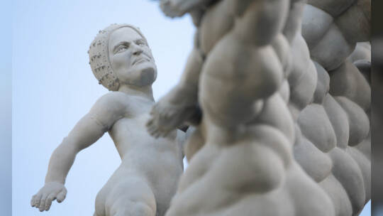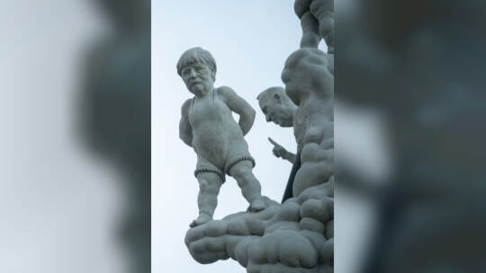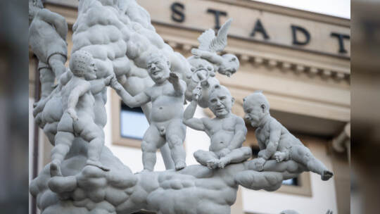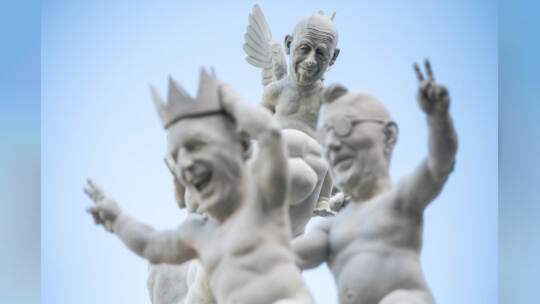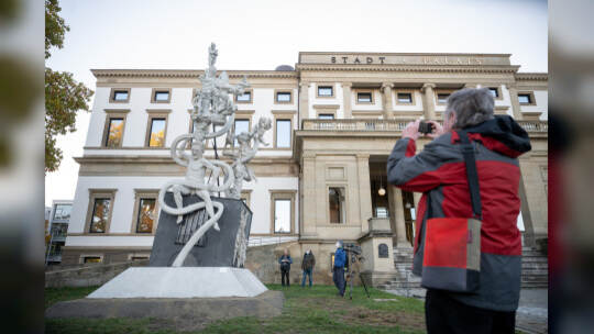 Das Bahnprojekt Stuttgart 21 bleibt umstritten. Künstler Peter Lenk nimmt das Thema mit einer Skulptur aufs Korn. In seinem Werk erkennt man Ministerpräsidenten des Musterländles, die Bundeskanzlerin, S21-Schlichter Heiner Geissler oder Alt-OB Manfred Rommel. Fotos: Sebastian Gollnow/dpa
